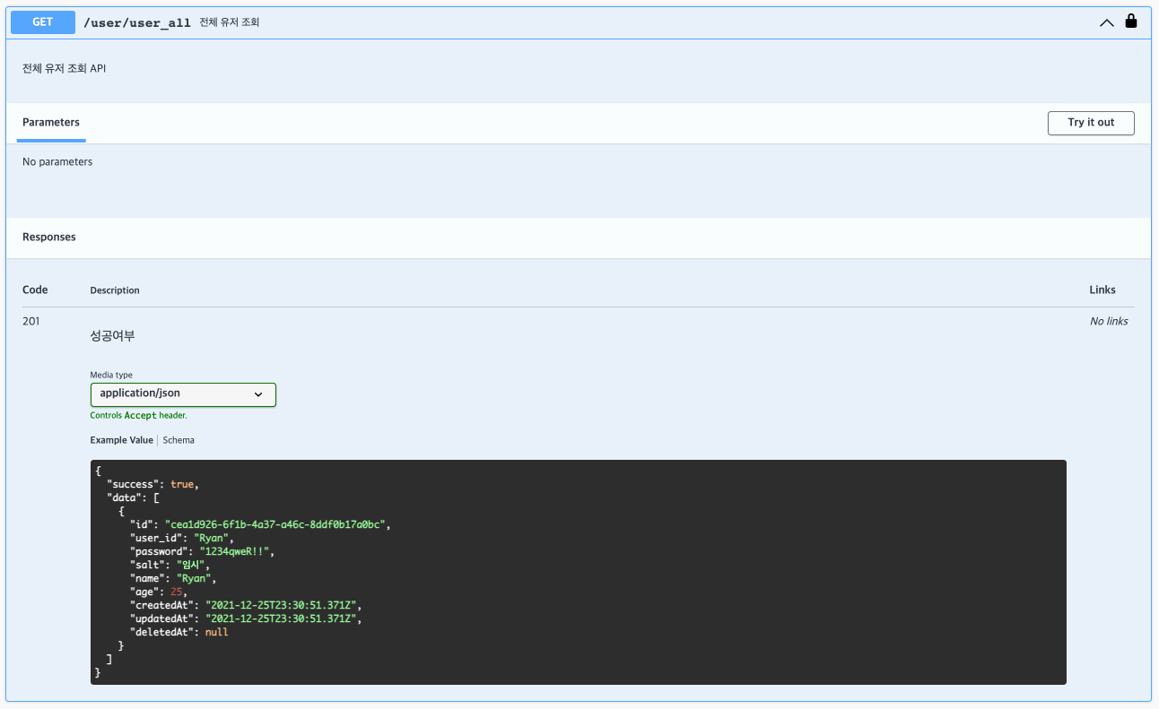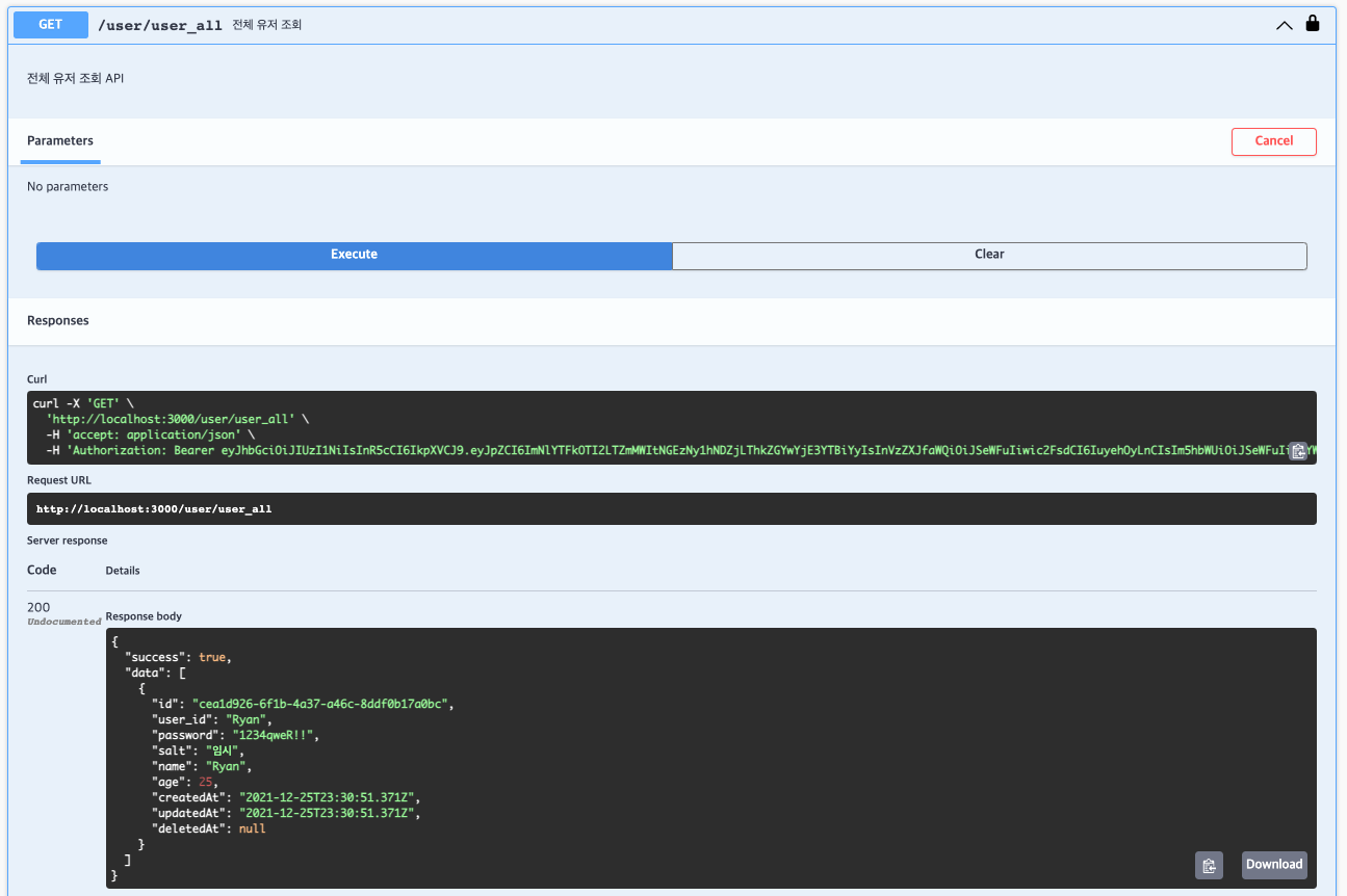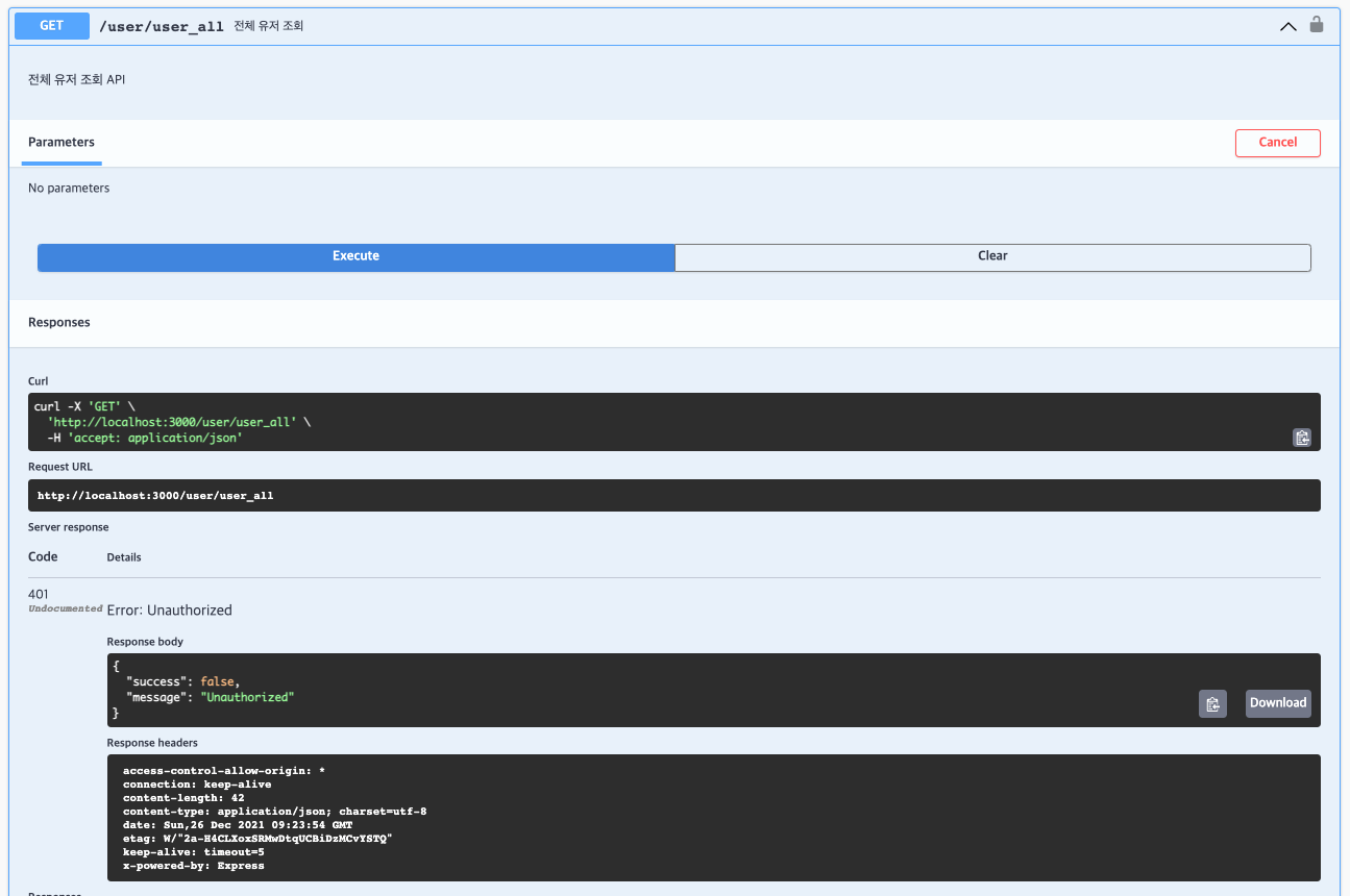 전체 유저 조회 API 오른쪽에 자물쇠 아이콘이 생성된 걸 알 수 있습니다. 인증이 필요한 API라는 걸 알 수 있습니다.