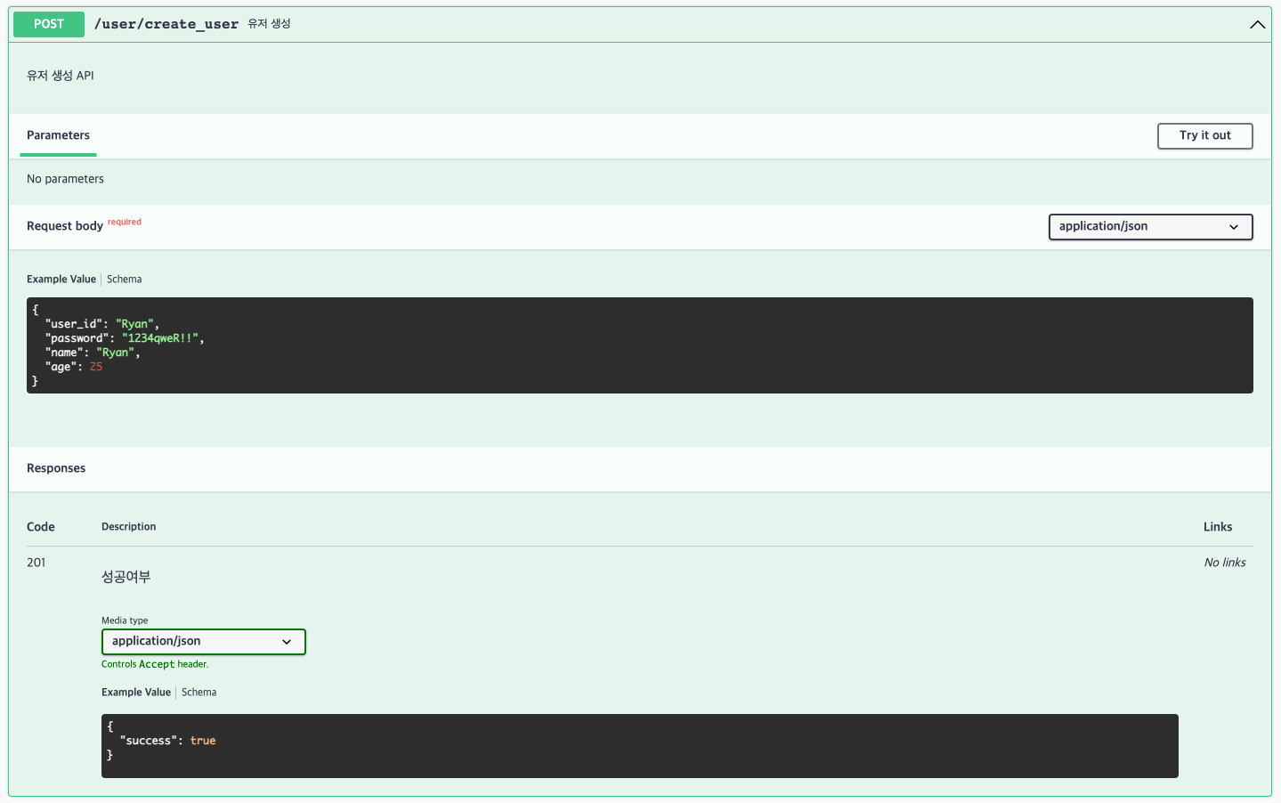 CreateUserDto 클래스에 @ApiProperty() 데코레이터를 통해 전송 데이터에 대한 정보를 정의합니다.