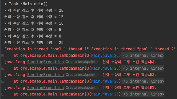 이제 main() 메서드에서 해당 커피 클래스를 생성하고 Thread를 통해 해당 수량을 감소하는 로직을 만들어보겠습니다.