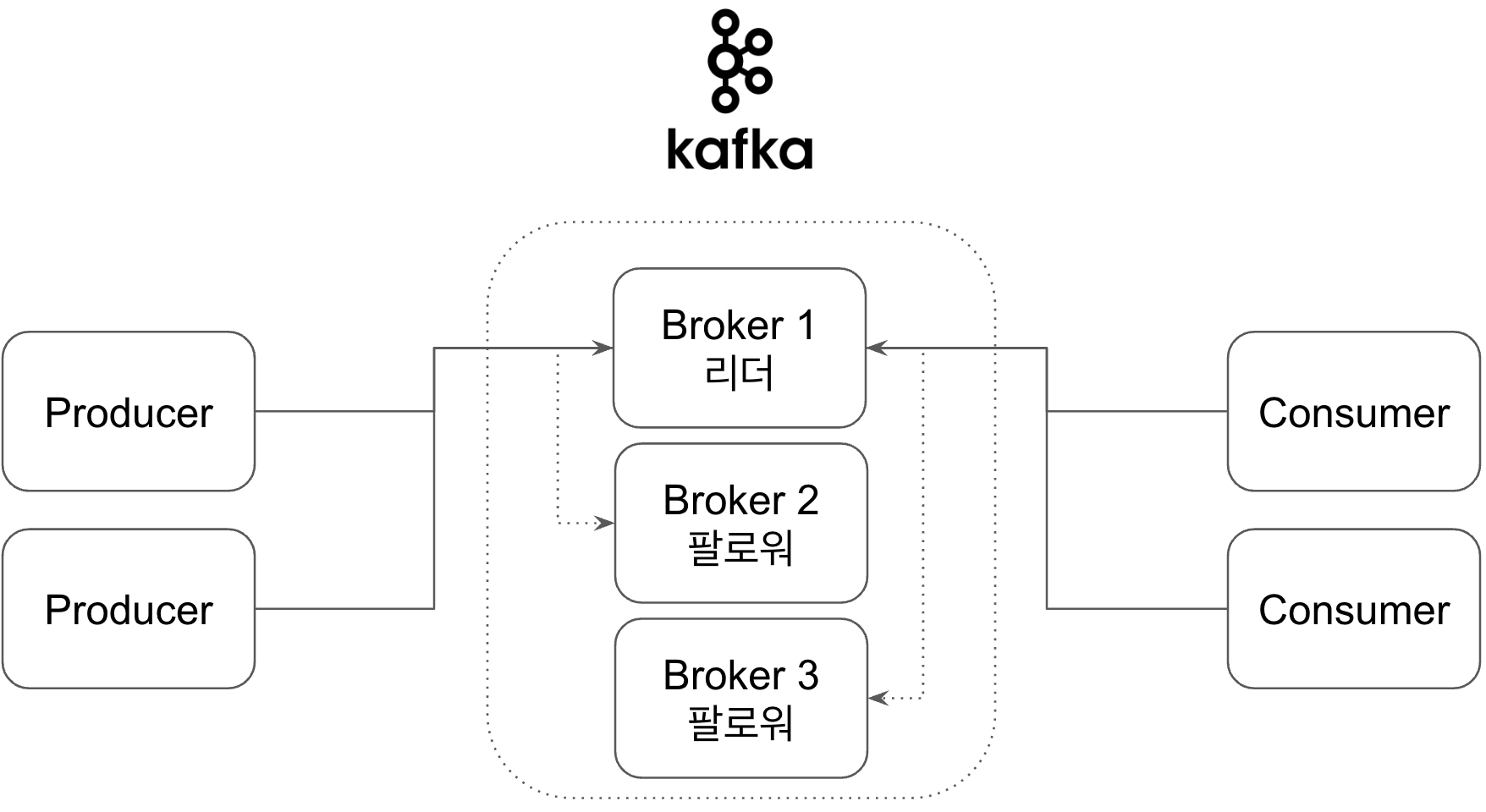 Producer와 Consumer는 리더 브로커와 연결해서 메시지를 전송하고 소비합니다. 전달 받은 데이터는 리더 브로커에 저장되며, 팔로워 브로커는 메시지를 가져가서 복제 합니다.