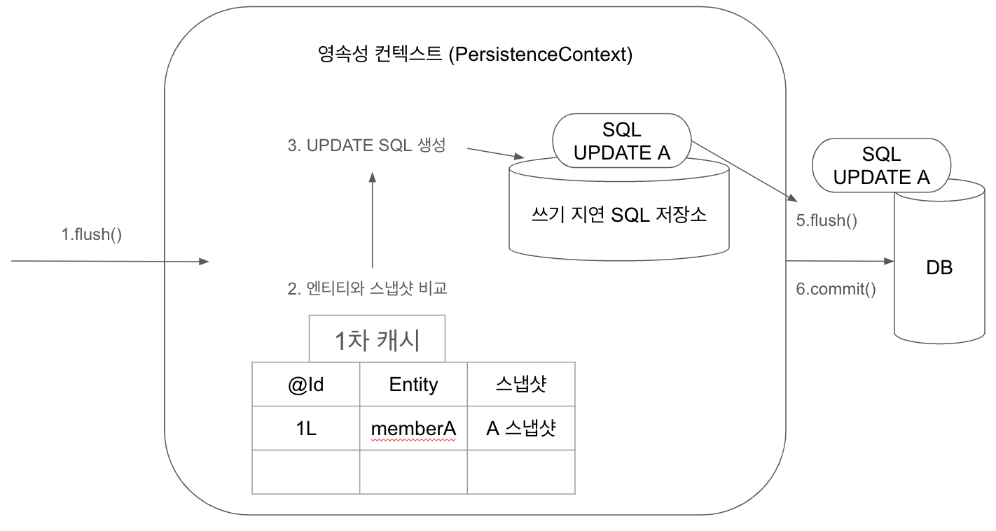 영속성 컨텍스트 안에 내부적으로 엔티티마다 버전을 관리하고 엔티티에 변경이 발생했을 때 그때 Update 쿼리가 실행됩니다.