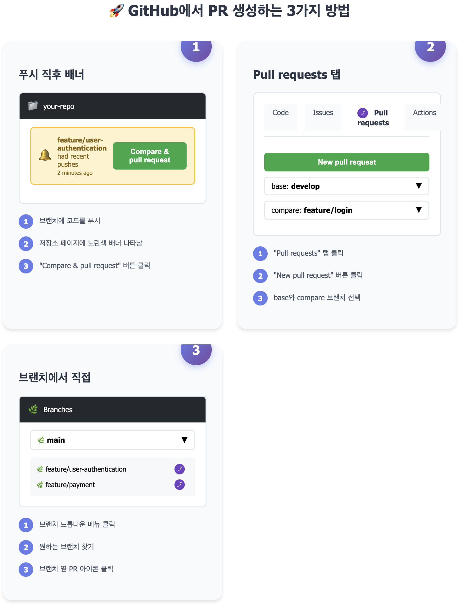 Pull Request(PR)는 내가 작성한 코드를 프로젝트의 메인 브랜치에 병합해달라고 요청하는 기능입니다. 단순히 코드를 합치는 것이 아니라, 코드 리뷰를 받고 팀원들과 소통하는 협업의 핵심 도구입니다.