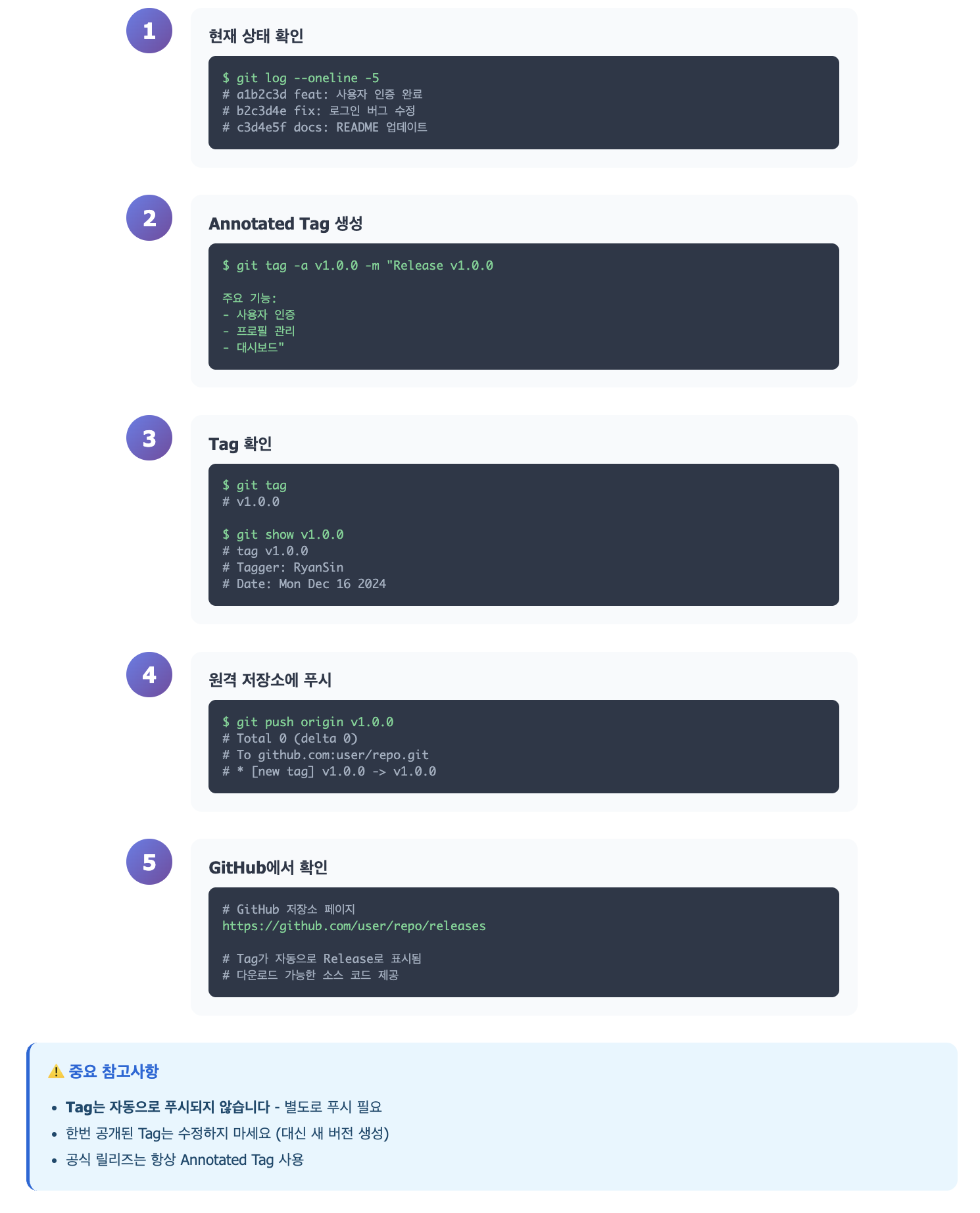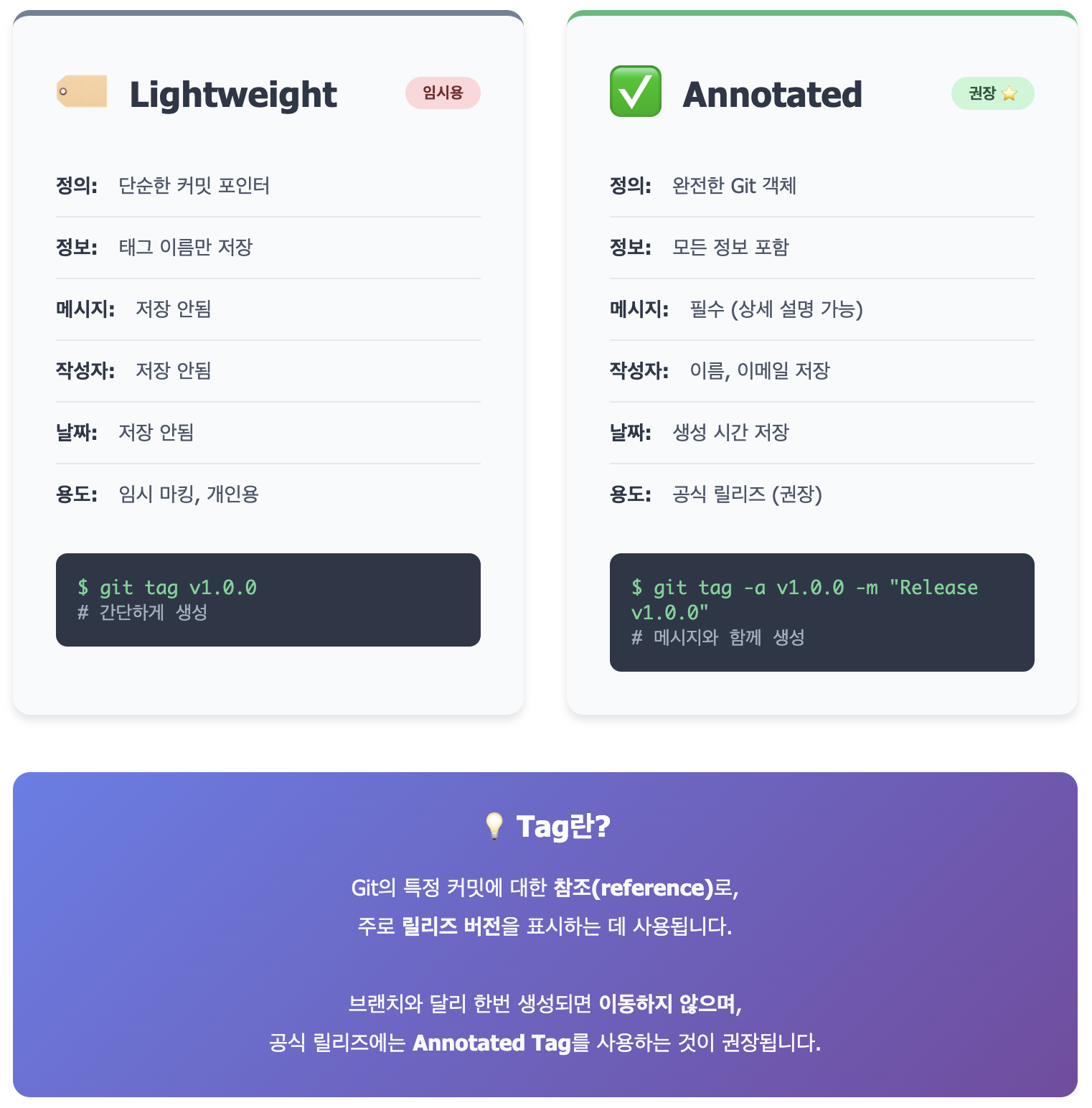 💡 권장: 공식 릴리즈는 항상 Annotated Tag를 사용하세요!