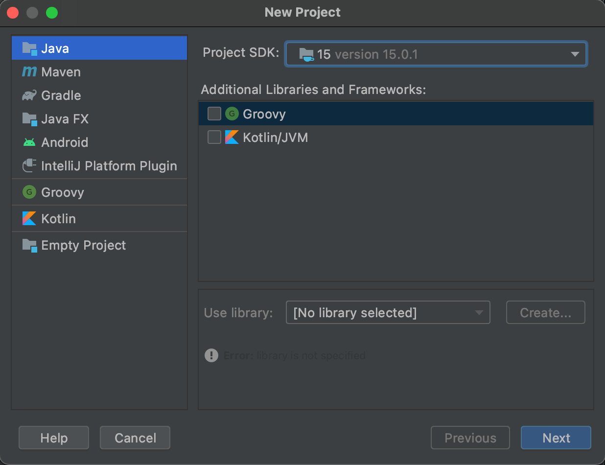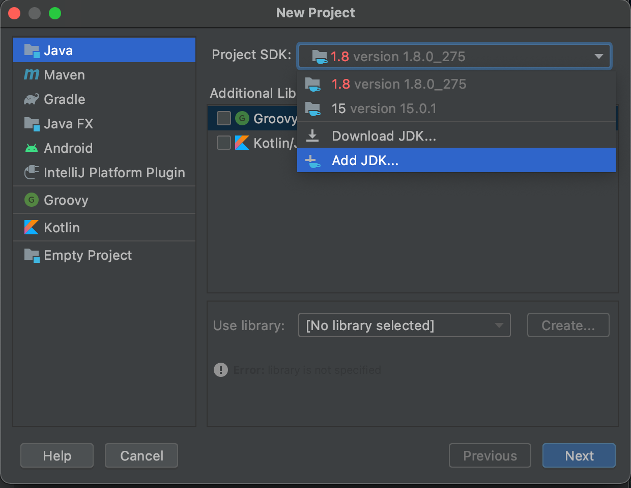 Project SDK 설정을 해야 Java 언어 프로젝트를 생성할 수 있다. (혹시 : Java를 설치하지 않았다면 Java를 설치해야합니다.)