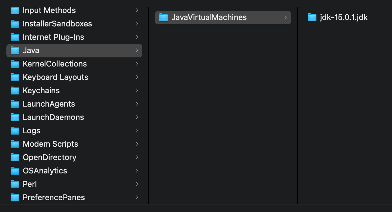 이전 블로그에서 설치한 경로를 확인해 보면 /Library/Java/JavaVirtualMachines/jdk-15.0.1.jdk 가 있다.