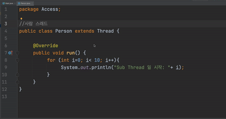 위 코드를 보시는 것 처럼 Thread 클래스를 상속받고 오버라이드 메스드인 run() 메서드를 선언한 후 반복문을 만들어 줬습니다.