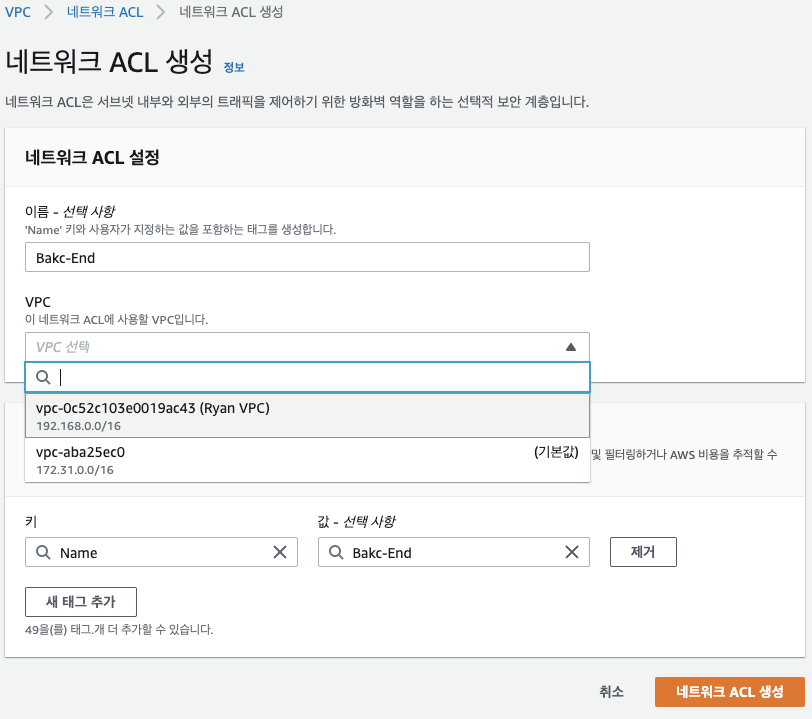 네트워크 ACL 생성 버튼을 클릭합니다.