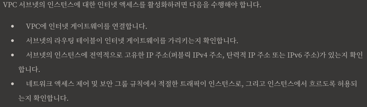 서브넷의 라우트 테이블이 인터넷 게이트웨이를 가리키도록 설정해야 합니다.