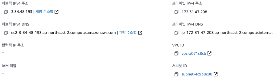 인스턴스를 확인해보면 탄력적 IP 항목이 추가된 걸 알 수 있습니다.