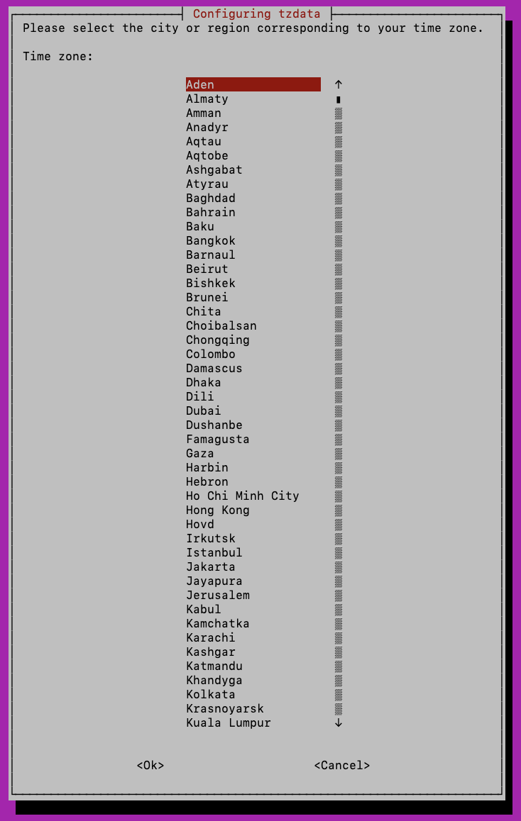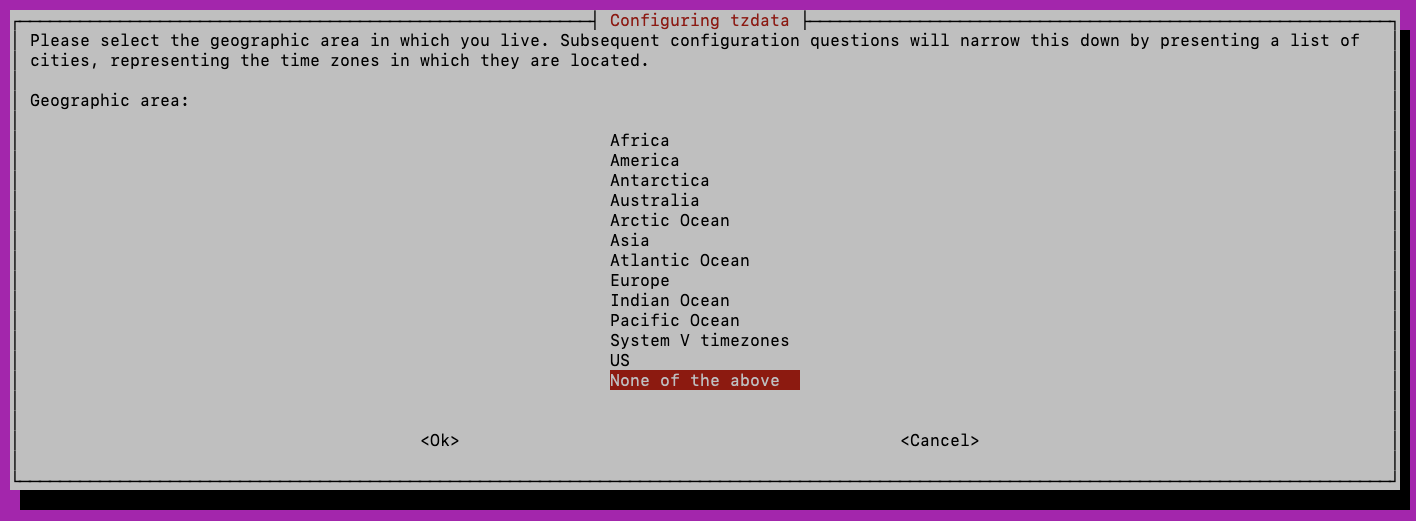 dpkg-reconfigure tzdata 명령어를 입력하면 아래와 같은 설정 화면이 보입니다.
