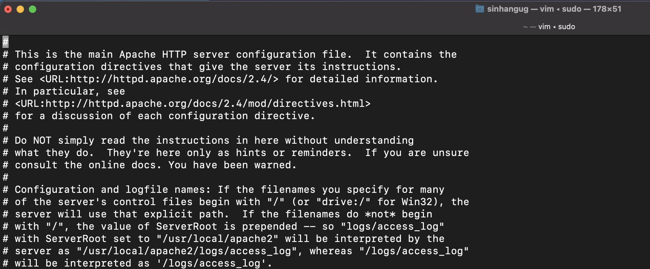 일단 vi 명령어로 해당 파일을 열어보겠습니다. -> sudo vi /etc/apache2/httpd.conf